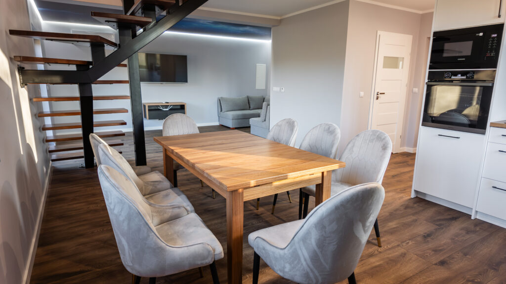 • W pełni wyposażona kuchnia ze zmywarką, lodówką i sprzętem AGD